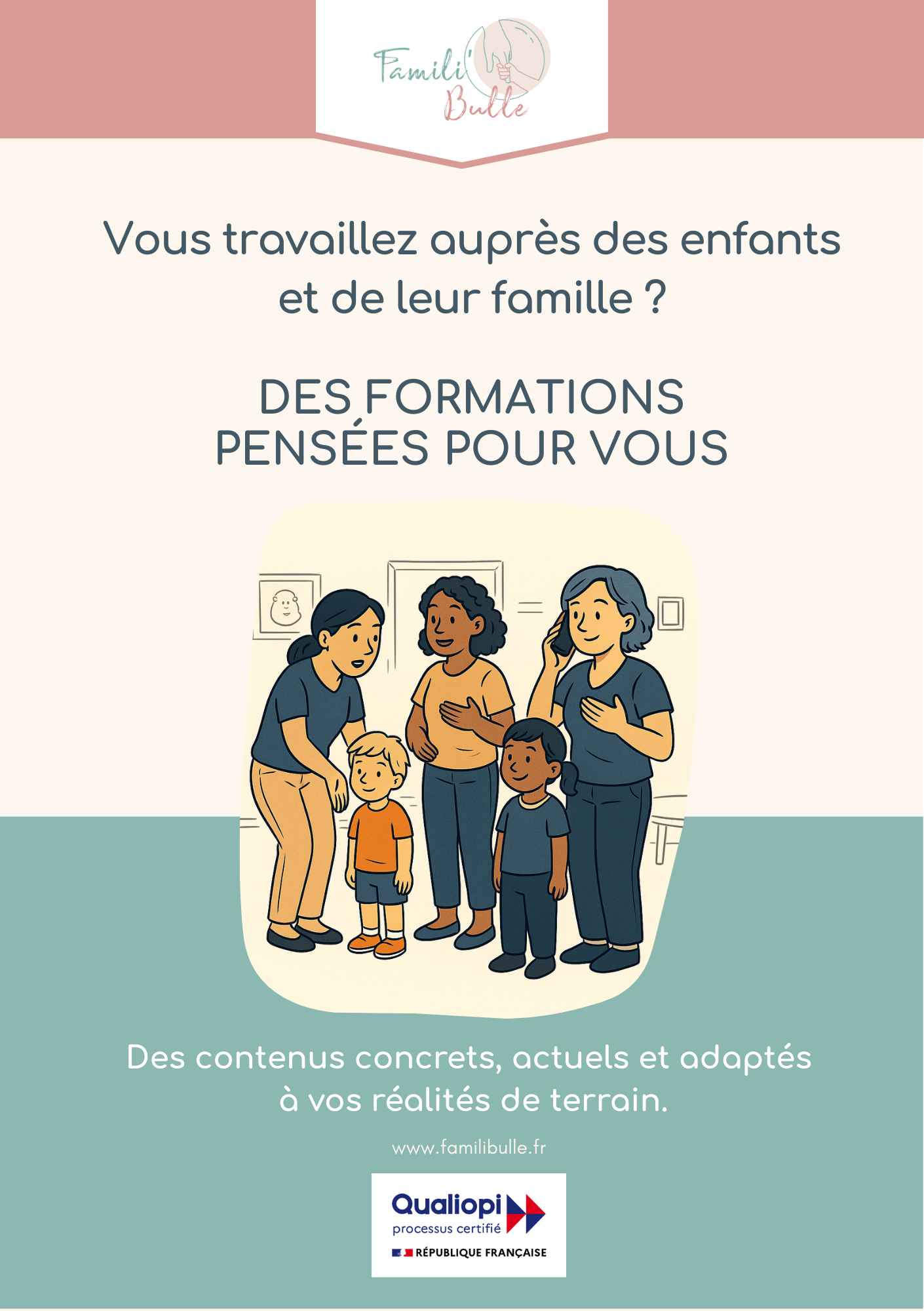 Ces formations s’inscrivent dans une démarche fondée sur les valeurs portées par Famili’Bulle : la bienveillance, le non jugement, l’écoute, la compréhension des réalités du terrain et la volonté d’agir au service du bien-être des enfants et de ceux qui les accompagnent.